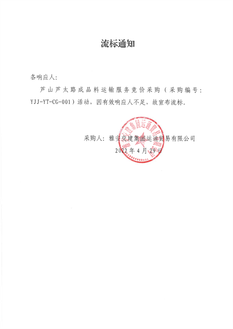 雅安交建集團(tuán)運(yùn)通貿(mào)易有限公司蘆山蘆太路成品料運(yùn)輸服務(wù)競價(jià)采購流標(biāo)通知