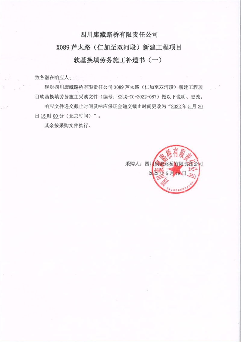 四川康藏路橋有限責(zé)任公司X089蘆太路(仁加至雙河段)新建工程項(xiàng)目軟基換填勞務(wù)施工補(bǔ)遺書(shū)(一)