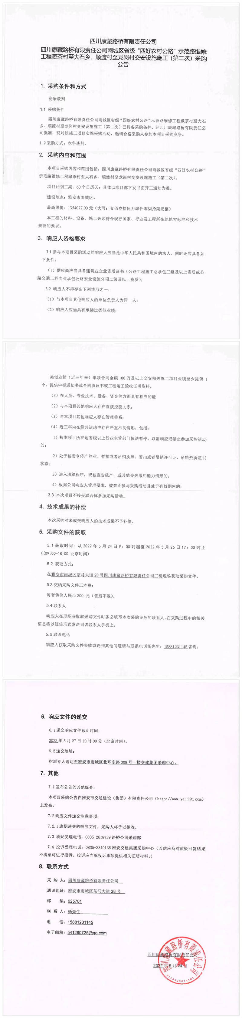 四川康藏路橋有限責任公司雨城區(qū)省級“四好農(nóng)村公路”示范路維修工程藏茶村至大石鄉(xiāng)、順渡村至龍崗村交安設施施工(第二次)采購公告