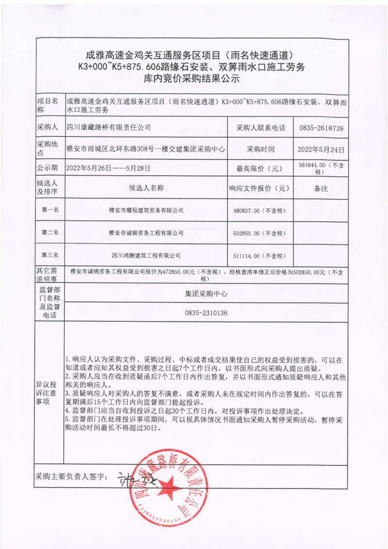四川康藏路橋有限責(zé)任公司成雅高速金雞關(guān)互通服務(wù)區(qū)項目(雨名快速通道)K3+000~K5+875.606路緣石安裝、雙箅雨水口施工勞務(wù)庫內(nèi)競價采購結(jié)果公示