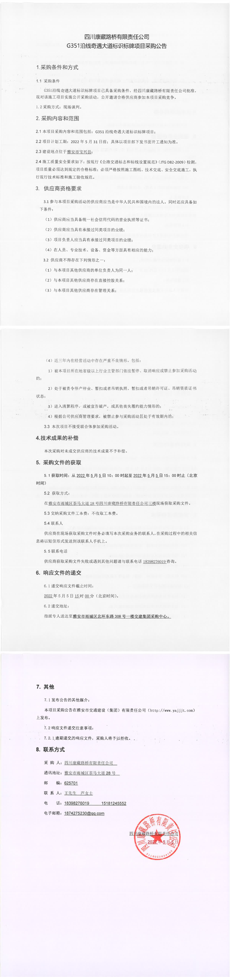 四川康藏路橋有限責(zé)任公司G351沿線奇遇大道標識標牌項目采購公告
