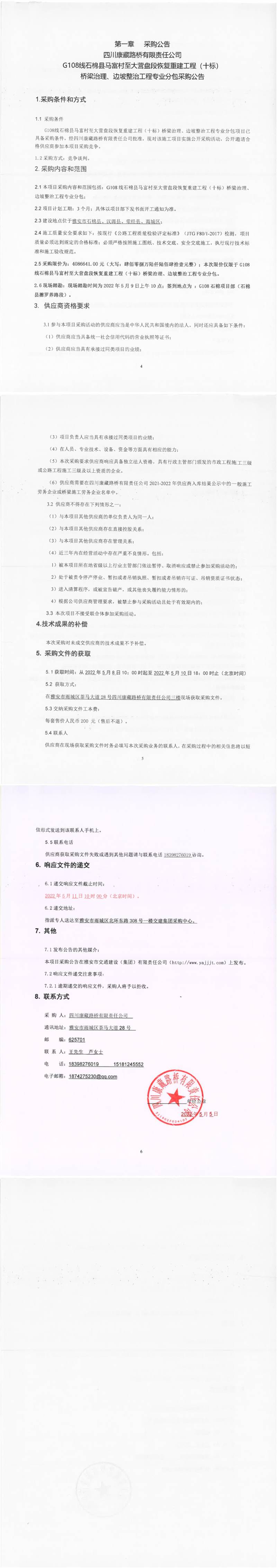 四川康藏路橋有限責任公司G108線石棉縣馬富村至大營盤段恢復(fù)重建工程(十標)橋梁治理、邊坡整治工程專業(yè)分包采購公告