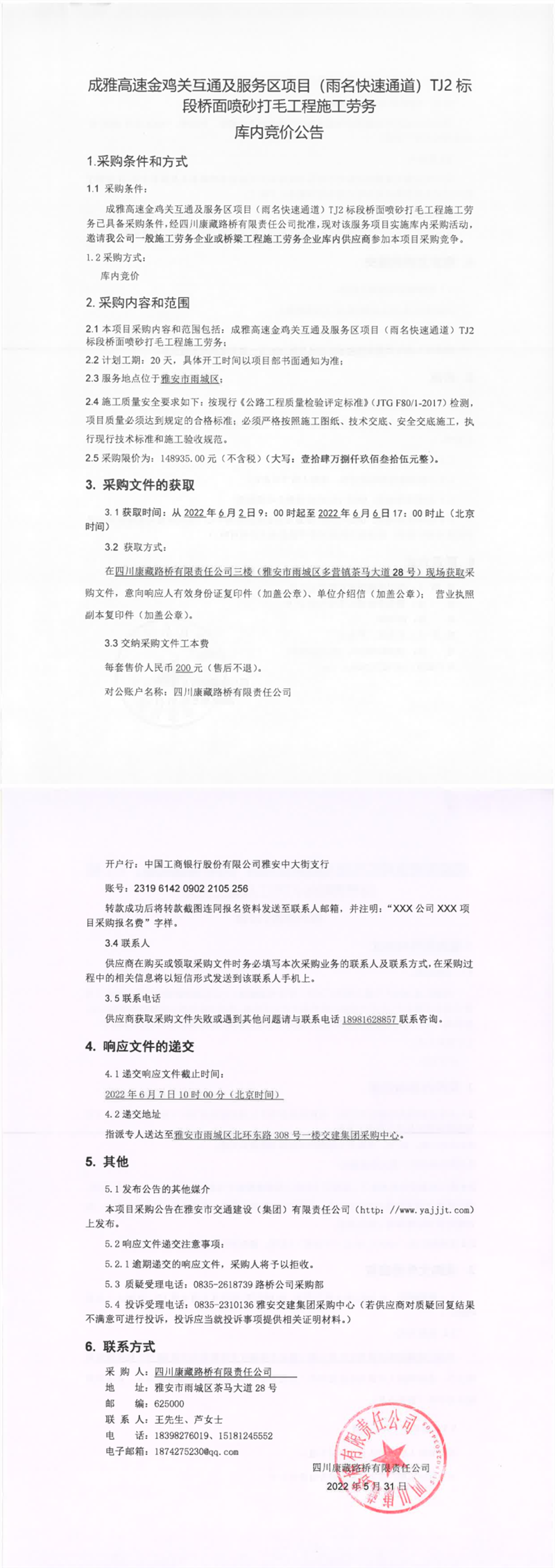 四川康藏路橋有限責(zé)任公司成雅高速金雞關(guān)互通及服務(wù)區(qū)項目(雨名快速通道)TJ2標(biāo)段橋面噴砂打毛工程施工勞務(wù)庫內(nèi)競價公告