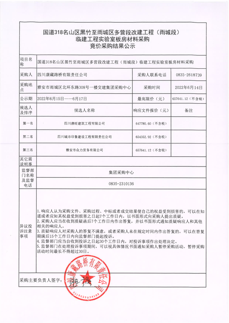 四川康藏路橋有限責(zé)任公司國(guó)道318名山區(qū)黑竹至雨城區(qū)多營(yíng)段改建工程(雨城段)臨建工程實(shí)驗(yàn)室板房材料采購(gòu)競(jìng)價(jià)采購(gòu)結(jié)果公示