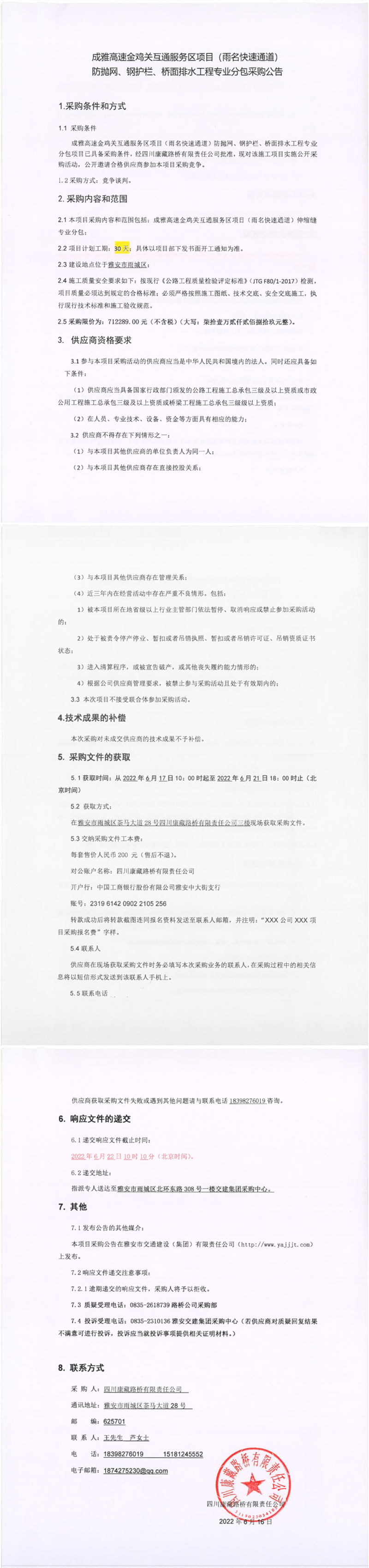 四川康藏路橋有限責任公司成雅高速金雞關互通服務區(qū)項目(雨名快速通道)防拋網(wǎng)、鋼護欄、橋面排水工程專業(yè)分包采購公告
