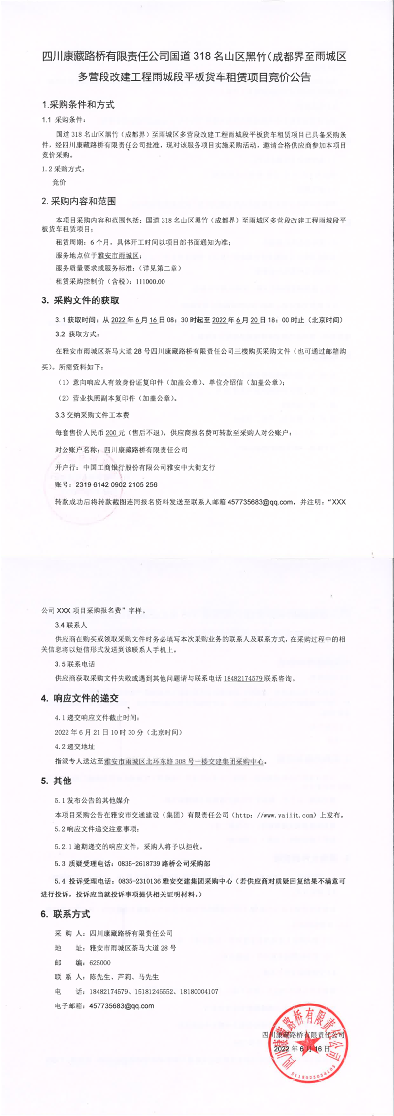 四川康藏路橋有限責(zé)任公司國(guó)道318名山區(qū)黑竹(成都界)至雨城區(qū)多營(yíng)段改建工程雨城段平板貨車租賃項(xiàng)目競(jìng)價(jià)公告