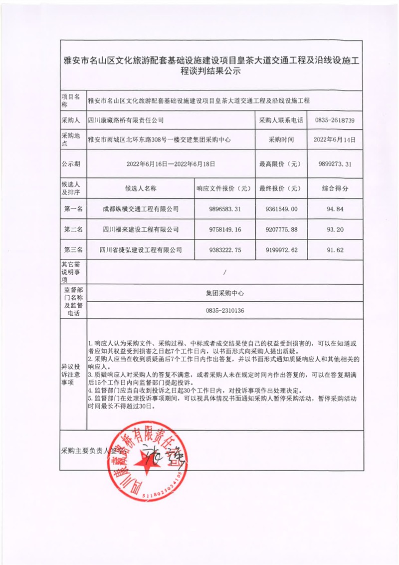 四川康藏路橋有限責任公司雅安市名山區(qū)文化旅游配套基礎設施建設項目皇茶大道交通工程及沿線設施工程談判結果公示