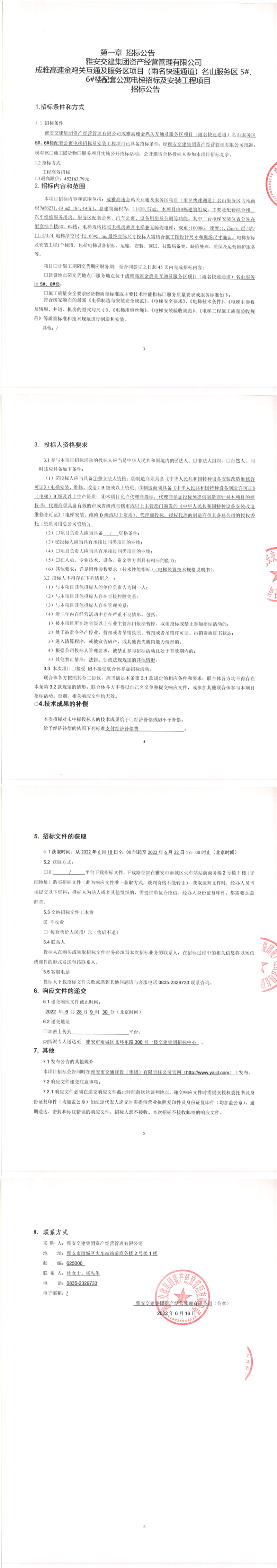 雅安交建集團(tuán)資產(chǎn)經(jīng)營(yíng)管理有限公司成雅高速金雞關(guān)互通及服務(wù)區(qū)項(xiàng)目(雨名快速通道)名山服務(wù)區(qū)5#、6#樓配套公寓電梯招標(biāo)及安裝工程項(xiàng)目