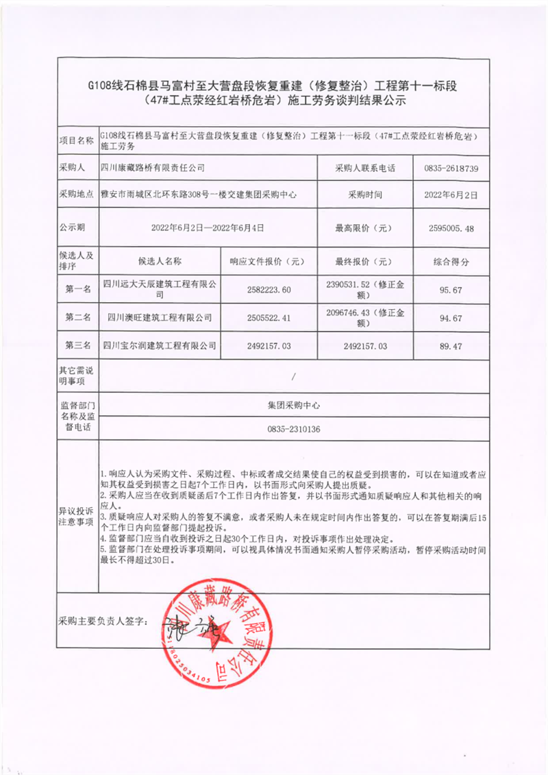四川康藏路橋有限責(zé)任公司G108線石棉縣馬富村至大營盤段恢復(fù)重建(修復(fù)整治)工程第十一標(biāo)段(47#工點(diǎn)滎經(jīng)紅巖橋危巖)施工勞務(wù)談判結(jié)果公示