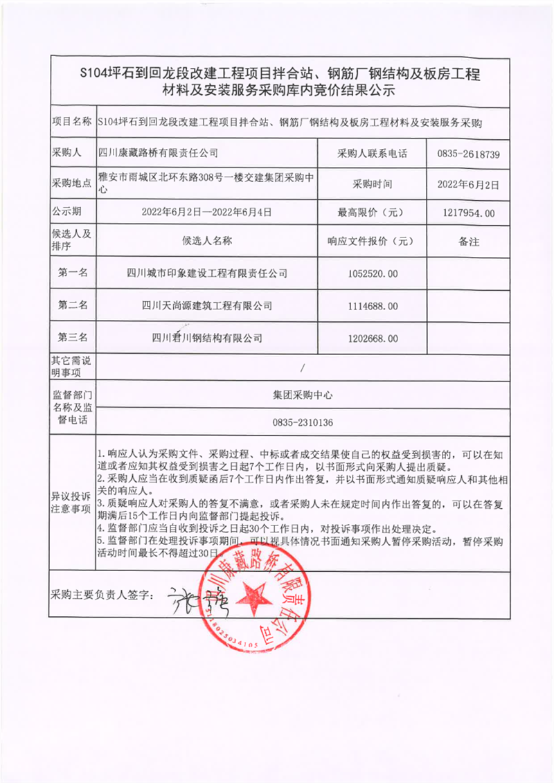 四川康藏路橋有限責(zé)任公司S104坪石到回龍段改建工程項(xiàng)目拌合站、鋼筋廠鋼結(jié)構(gòu)及板房工程材料及安裝服務(wù)庫內(nèi)競(jìng)價(jià)結(jié)果公示