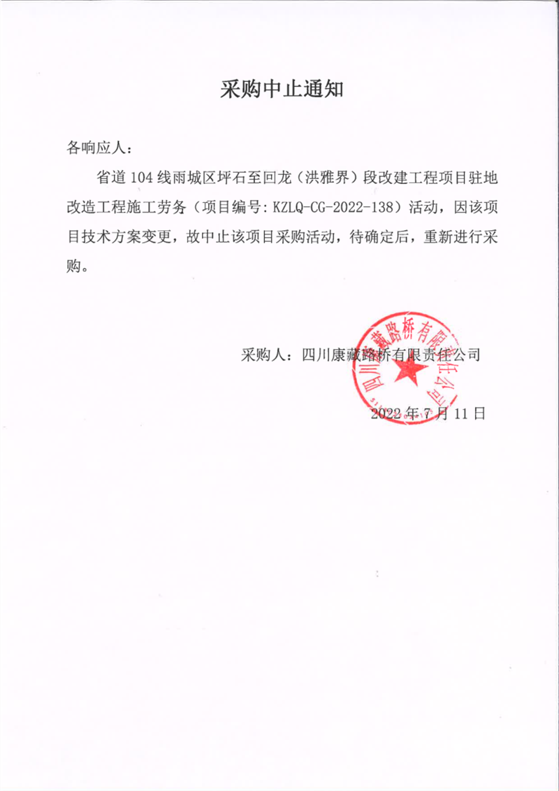 四川康藏路橋有限責任公司省道104線雨城區(qū)坪石至回龍(洪雅界)段改建工程項目駐地改造工程施工勞務采購中止通知
