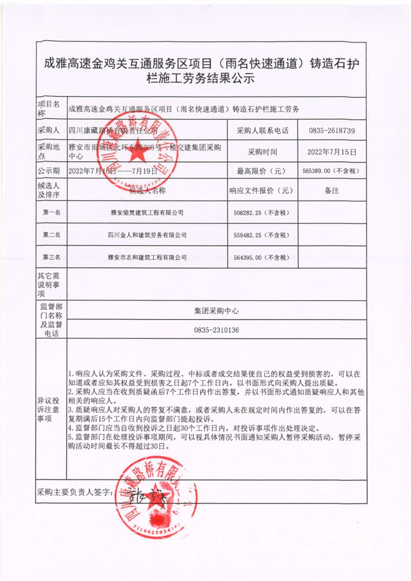 四川康藏路橋有限責(zé)任公司成雅高速金雞關(guān)互通服務(wù)區(qū)項目(雨名快速通道)鑄造石護欄工程施工勞務(wù)結(jié)果公示