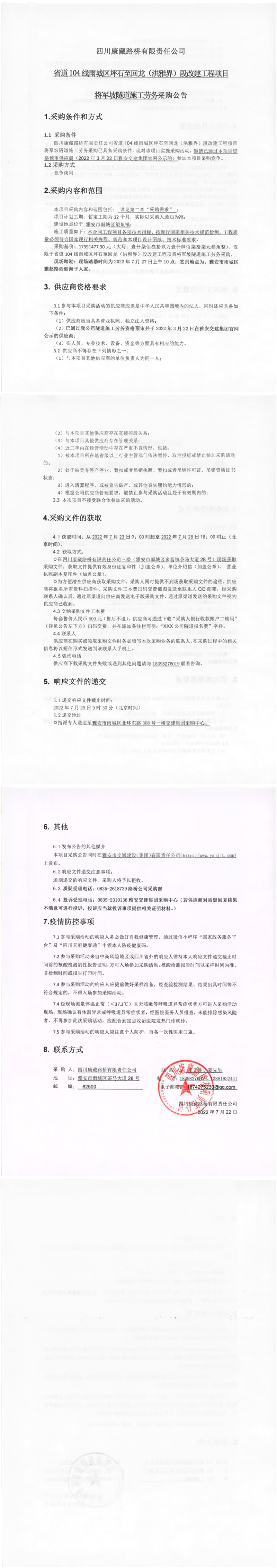 四川康藏路橋有限責(zé)任公司省道104線雨城區(qū)坪石至回龍(洪雅界)段改建工程項(xiàng)目將軍坡隧道施工勞務(wù)采購(gòu)公告