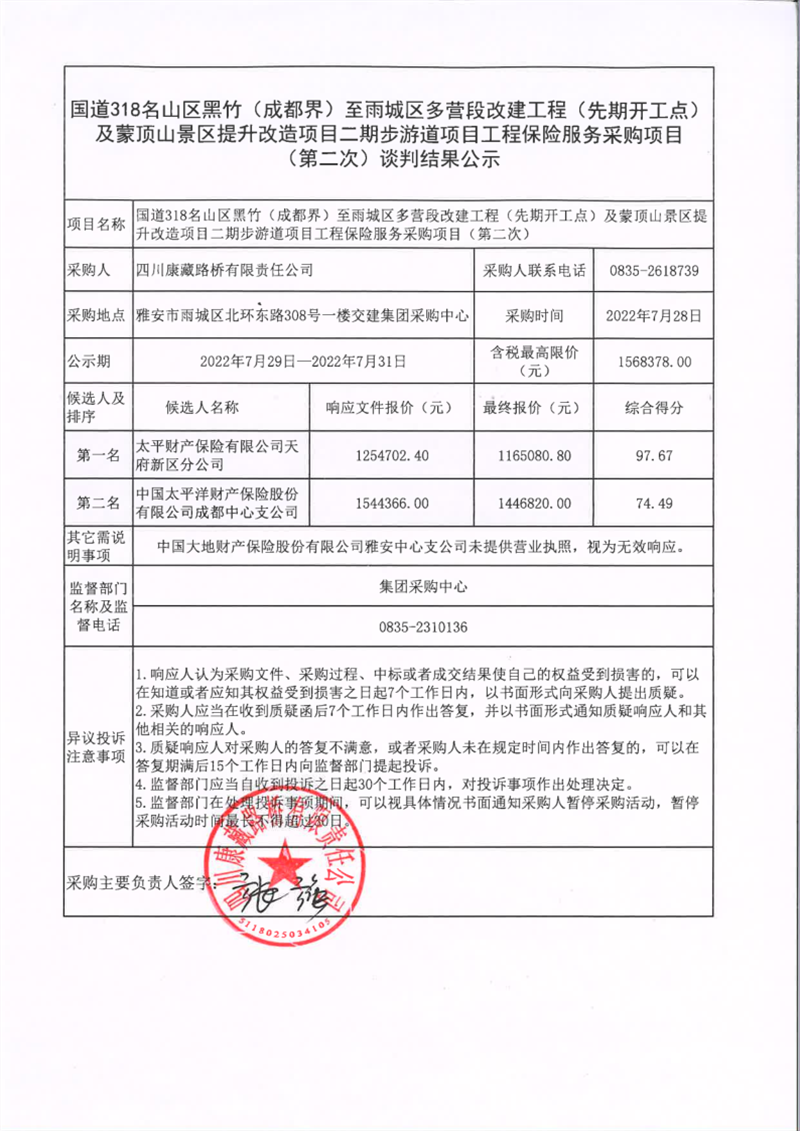 四川康藏路橋有限責(zé)任公司國(guó)道318名山區(qū)黑竹(成都界)至雨城區(qū)多營(yíng)段改建工程(先期開工點(diǎn))及蒙頂山景區(qū)提升改造項(xiàng)目二期步游道項(xiàng)目工程保險(xiǎn)服務(wù)采購(gòu)項(xiàng)目(第二次)談判結(jié)果公示