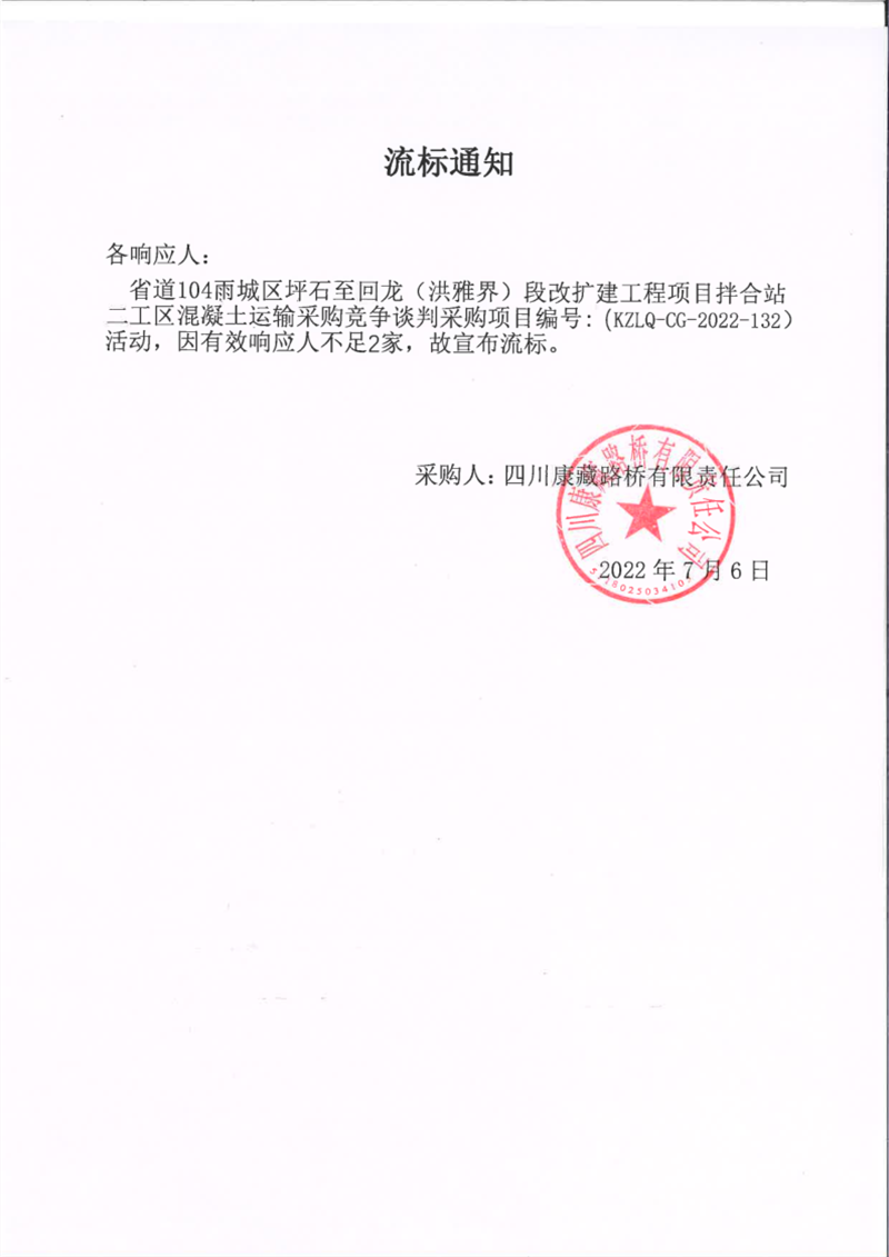 四川康藏路橋有限責任公司省道104線雨城區(qū)坪石至回龍(洪雅界)段改建工程項目拌合站二工區(qū)混凝土運輸采購競爭談判采購項目流標通知