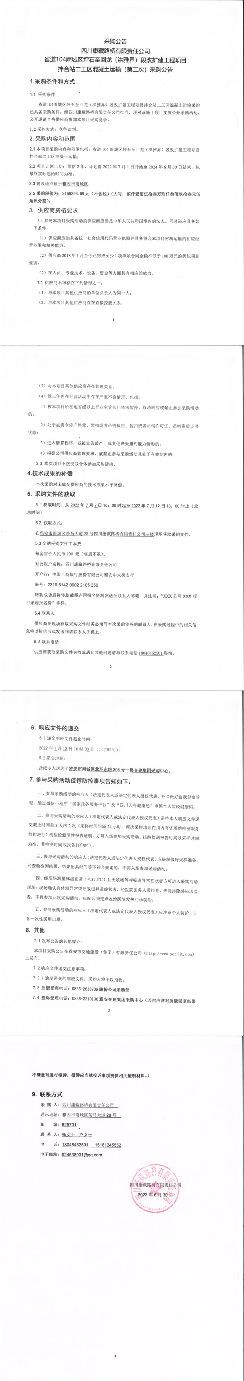 四川康藏路橋有限責(zé)任公司省道104雨城區(qū)坪石至回龍(洪雅界)段改建工程項目拌合站二工區(qū)混凝土運輸(第二次)采購公告