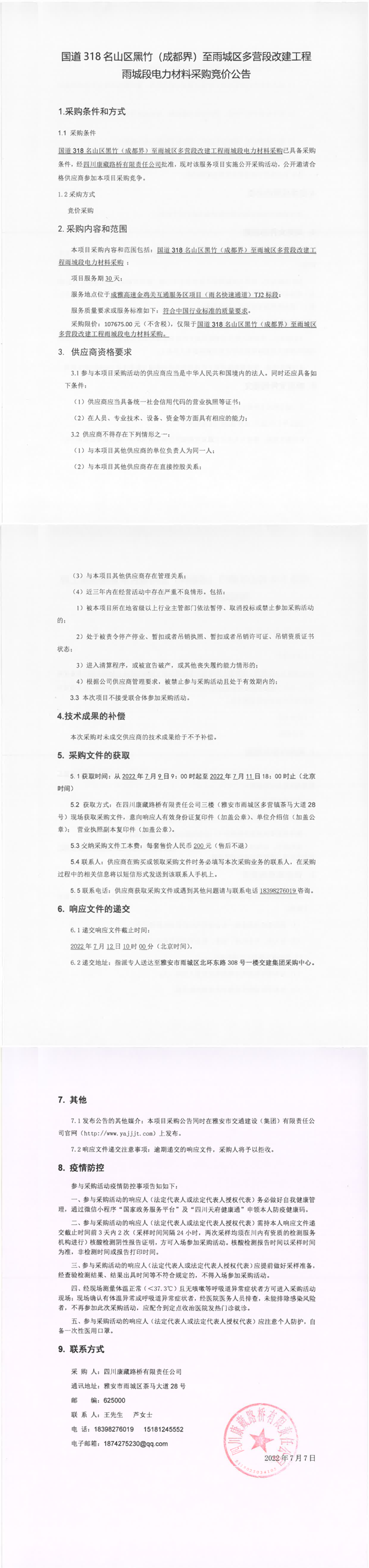 四川康藏路橋有限責(zé)任公司國道318名山區(qū)黑竹(成都界)至雨城區(qū)多營段改建工程雨城段電力材料采購競價公告