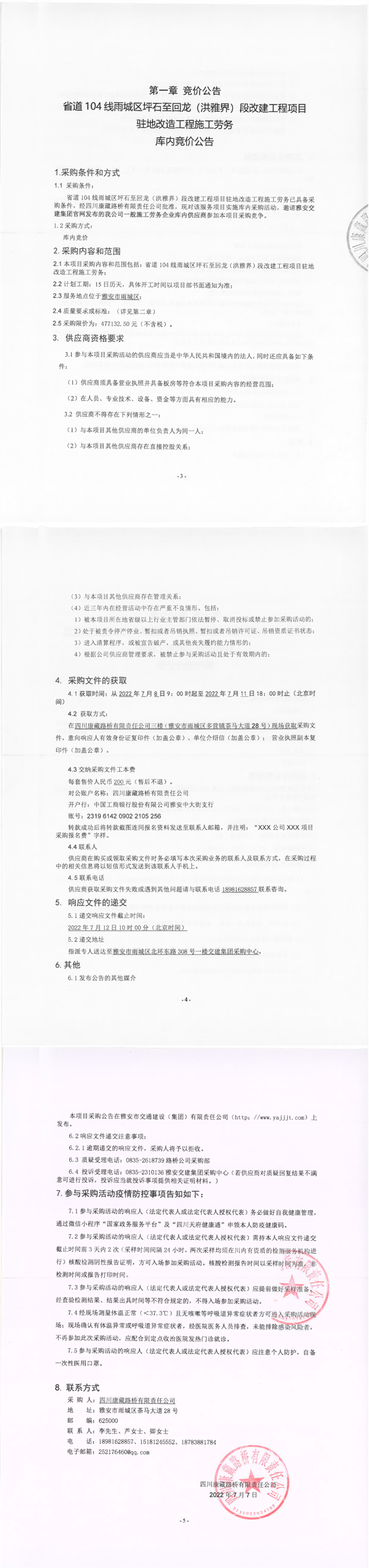 四川康藏路橋有限責任公司省道104線雨城區(qū)坪石至回龍(洪雅界)段改建工程項目駐地改造工程施工勞務庫內(nèi)競價公告