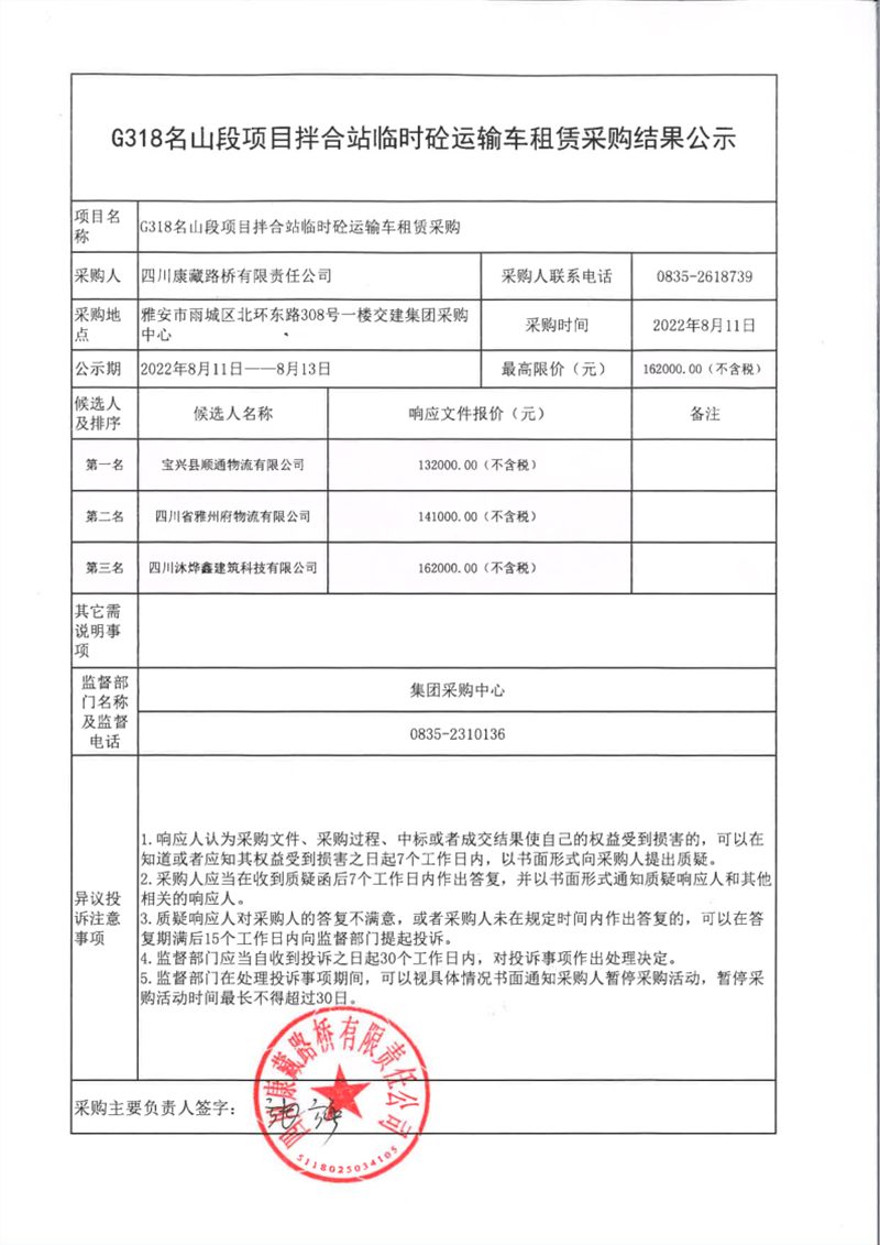 四川康藏路橋有限責任公司G318名山段項目拌合站臨時砼運輸車租賃采購結果公示