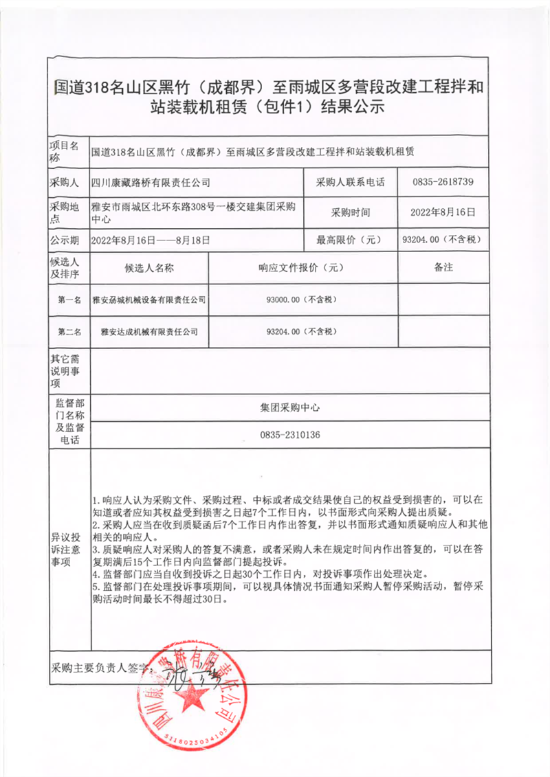 四川康藏路橋有限責(zé)任公司國道318名山區(qū)黑竹(成都界)至雨城區(qū)多營段改建工程拌和站裝載機租賃(包件1)結(jié)果公示
