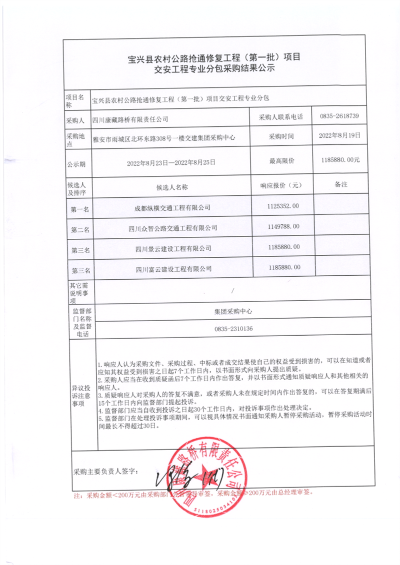 四川康藏路橋有限責(zé)任公司寶興縣農(nóng)村公路搶通修復(fù)工程(第一批)交安工程專(zhuān)業(yè)分包采購(gòu)結(jié)果公示