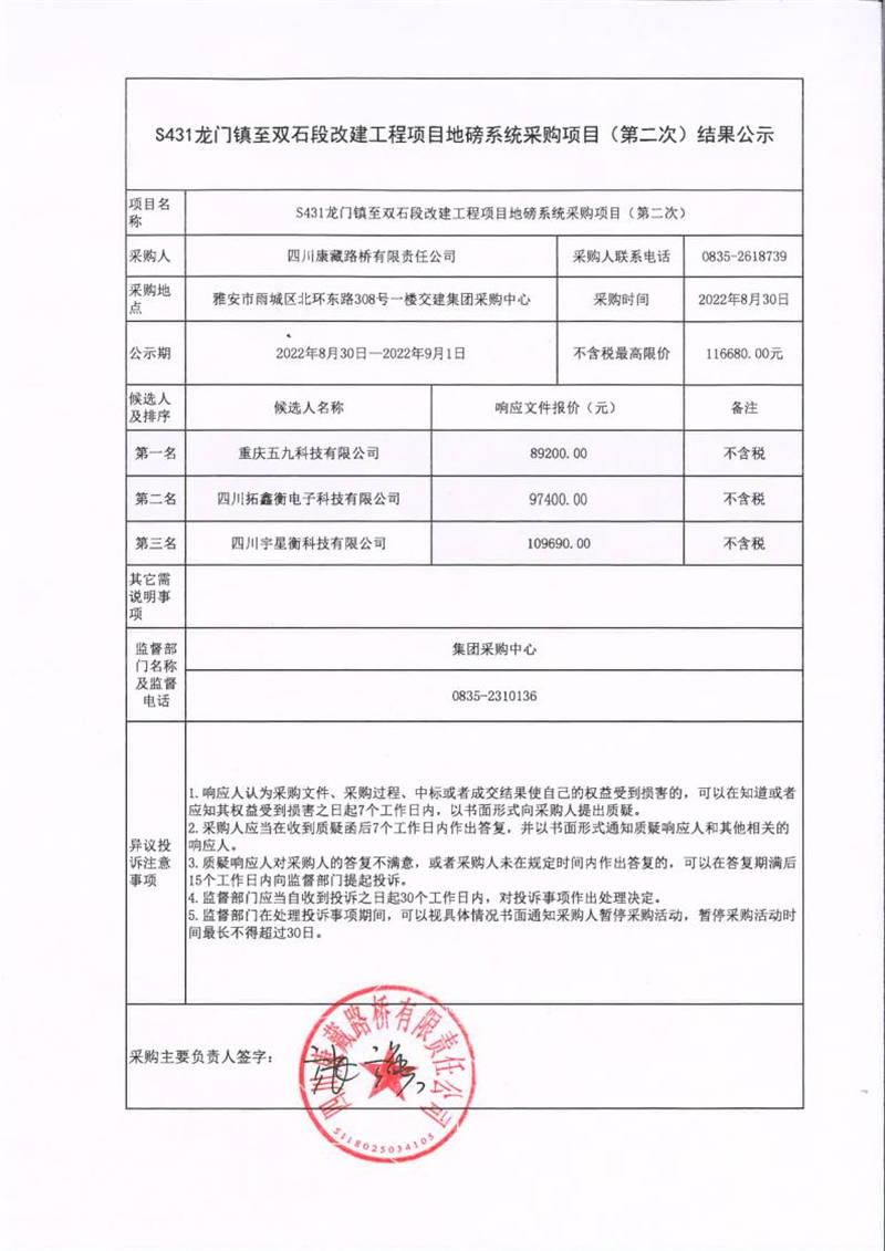四川康藏路橋有限責(zé)任公司S431龍門鎮(zhèn)至雙石段改建工程項(xiàng)目地磅系統(tǒng)采購項(xiàng)目(第二次)結(jié)果公示