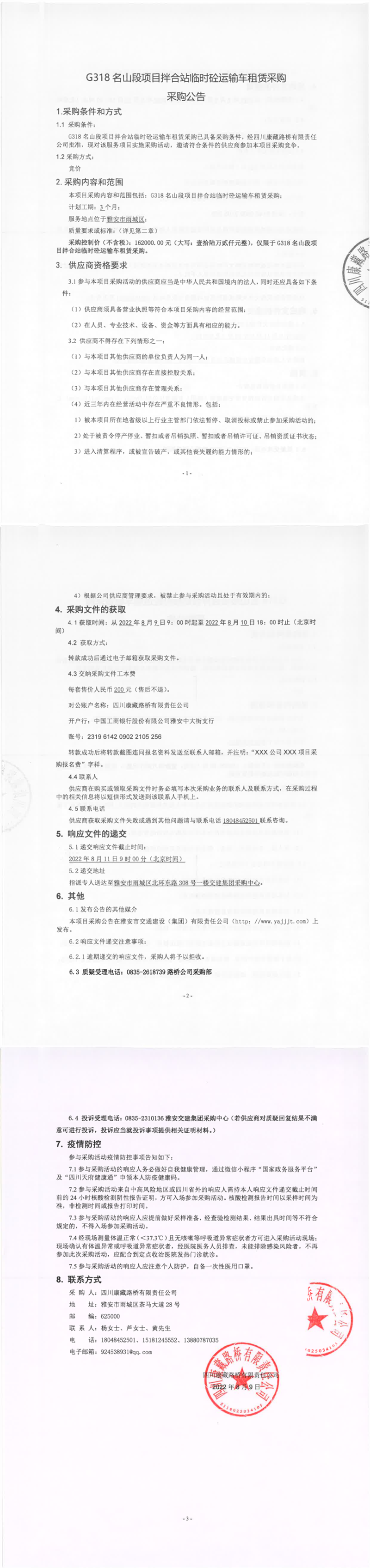 四川康藏路橋有限責(zé)任公司G318名山段項目拌合站臨時砼運輸車租賃采購采購公告