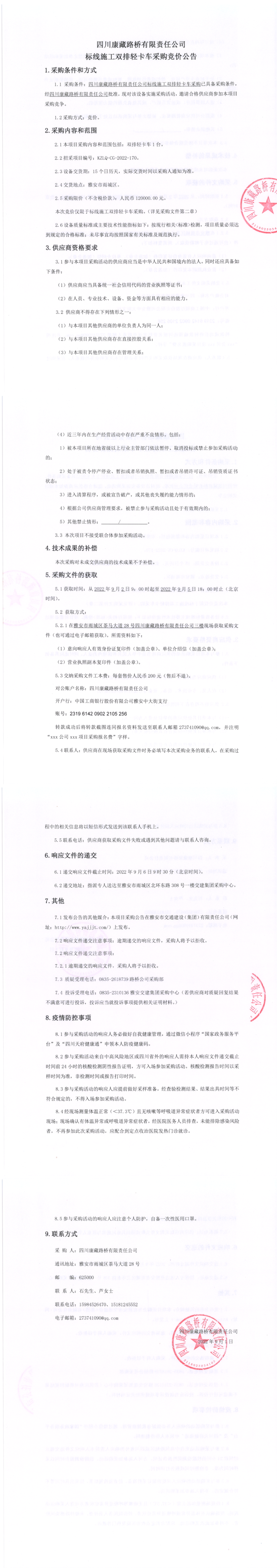 四川康藏路橋有限責(zé)任公司標(biāo)線施工雙排輕卡車(chē)采購(gòu)競(jìng)價(jià)公告