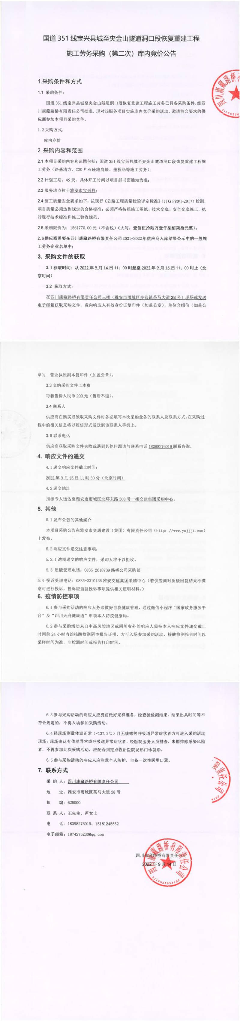 四川康藏路橋有限責(zé)任公司國(guó)道351線(xiàn)寶興縣城至夾金山隧道洞口段恢復(fù)重建工程施工勞務(wù)采購(gòu)(第二次)庫(kù)內(nèi)競(jìng)價(jià)公告