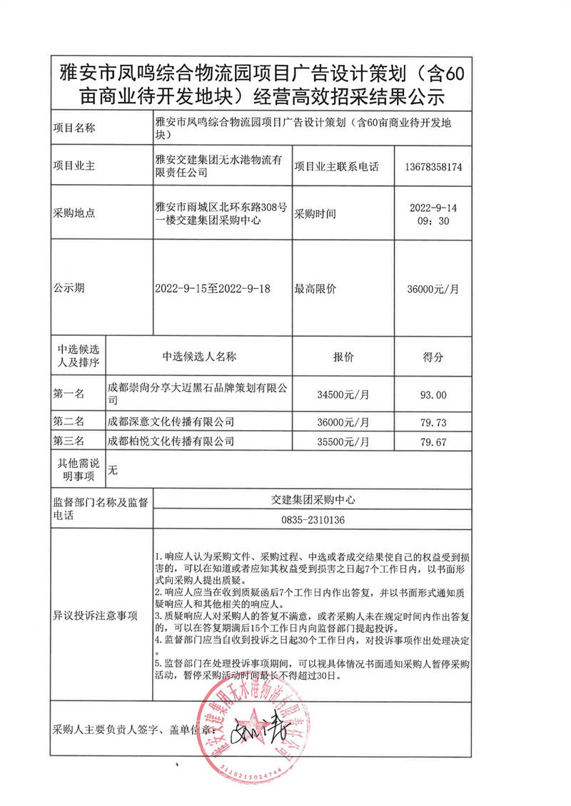 雅安交建集團無水港物流有限責(zé)任公司雅安市鳳鳴綜合物流園項目廣告設(shè)計策劃(含60畝商業(yè)待開發(fā)地塊)經(jīng)營高效招采結(jié)果公示