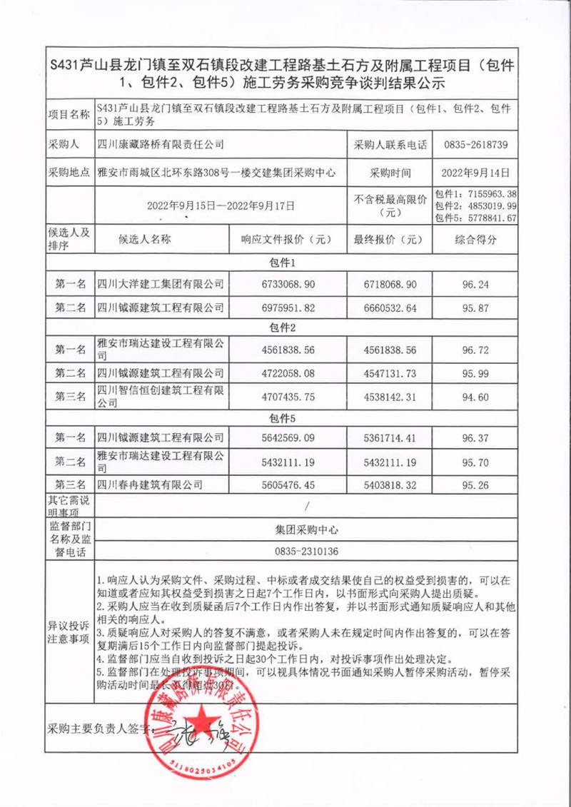 四川康藏路橋有限責(zé)任公司S431蘆山縣龍門(mén)鎮(zhèn)至雙石鎮(zhèn)段改建工程路基土石方及附屬工程項(xiàng)目(包件1、包件2、包件5)施工勞務(wù)采購(gòu)競(jìng)爭(zhēng)談判結(jié)果公示