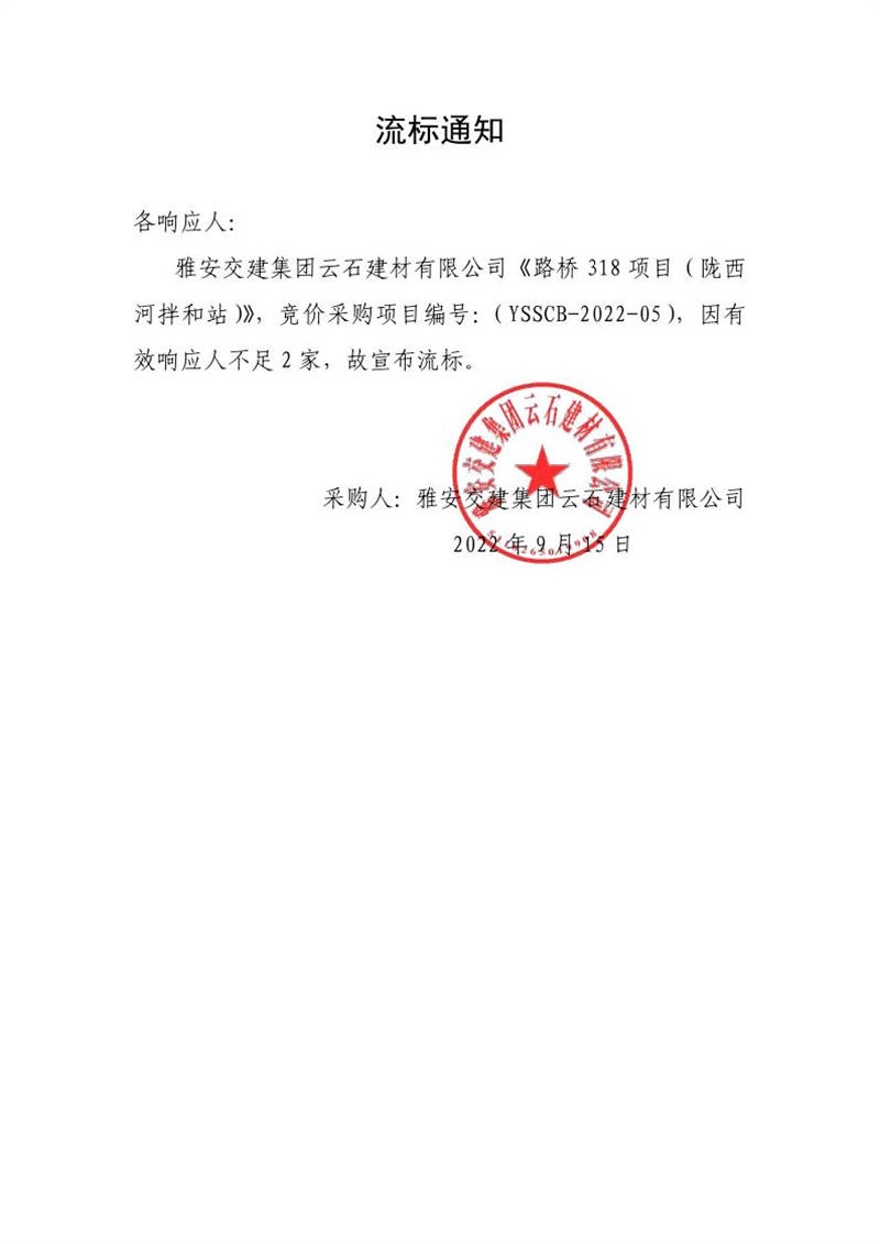 雅安交建集團(tuán)云石建材有限公司成品料運(yùn)輸服務(wù)采購(gòu)(隴西河拌和站)流標(biāo)通知