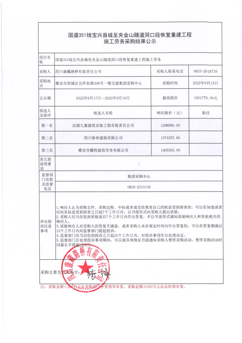 四川康藏路橋有限責任公司國道351線寶興縣城至夾金山隧道洞口段恢復重建工程施工勞務采購結(jié)果公示