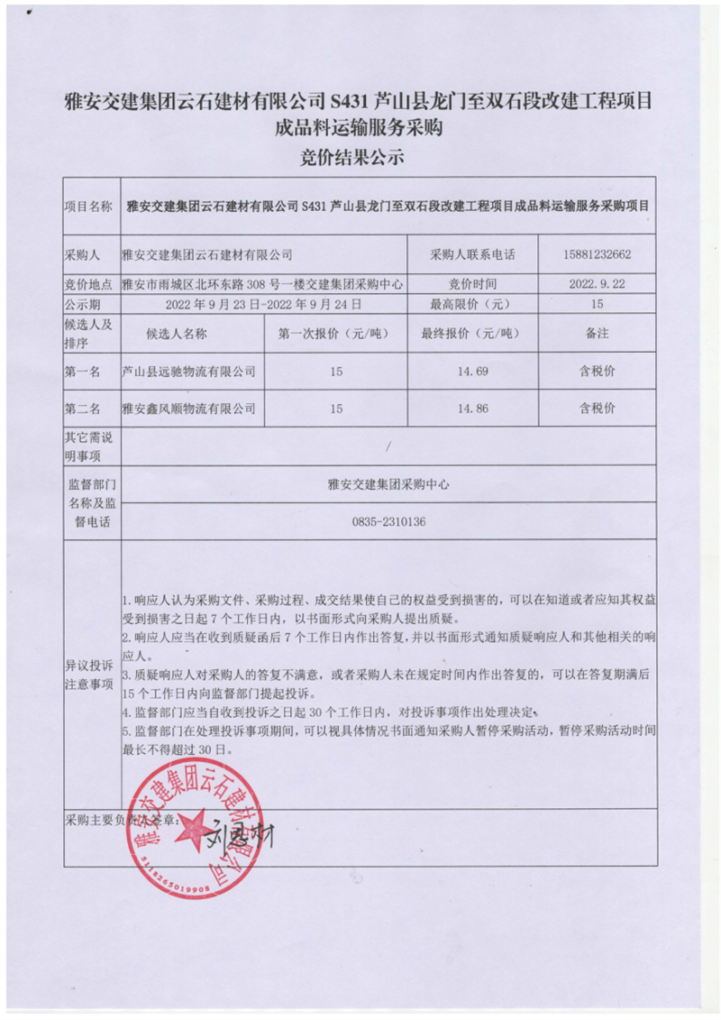 雅安交建集團(tuán)云石建材有限公司S431蘆山縣龍門至雙石段改建工程項(xiàng)目成品料運(yùn)輸服務(wù)采購(gòu)競(jìng)價(jià)結(jié)果公示