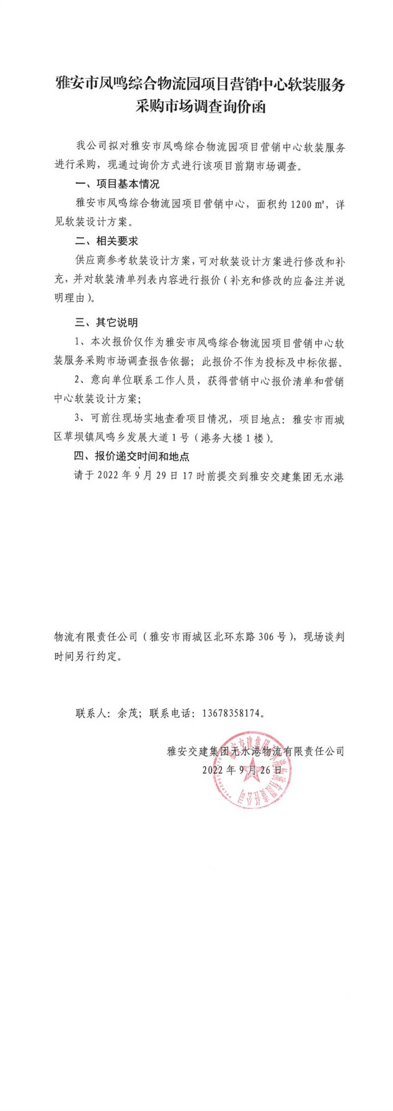 雅安交建集團(tuán)無(wú)水港物流有限責(zé)任公司雅安市鳳鳴綜合物流園項(xiàng)目營(yíng)銷(xiāo)中心軟裝服務(wù)采購(gòu)市場(chǎng)調(diào)查詢(xún)價(jià)函