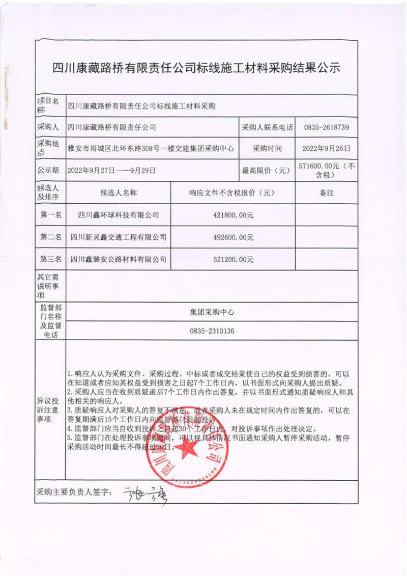 四川康藏路橋有限責(zé)任公司標線施工材料采購結(jié)果公示