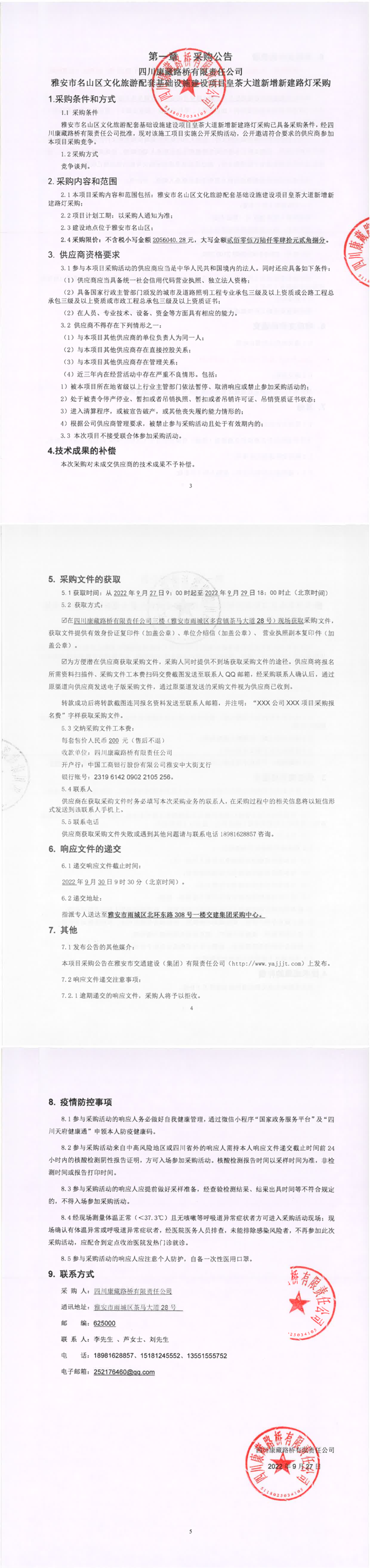四川康藏路橋有限責(zé)任公司雅安市名山區(qū)文化旅游配套基礎(chǔ)設(shè)施建設(shè)項(xiàng)目皇茶大道新增新建路燈采購公告