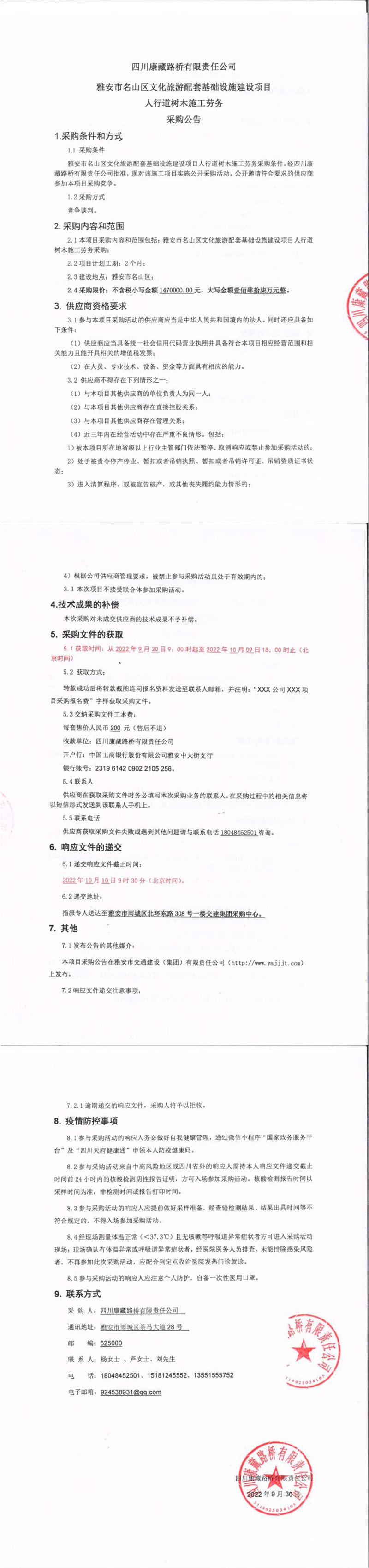 四川康藏路橋有限責(zé)任公司雅安市名山區(qū)文化旅游配套基礎(chǔ)設(shè)施建設(shè)項目人行道樹木施工勞務(wù)采購公告
