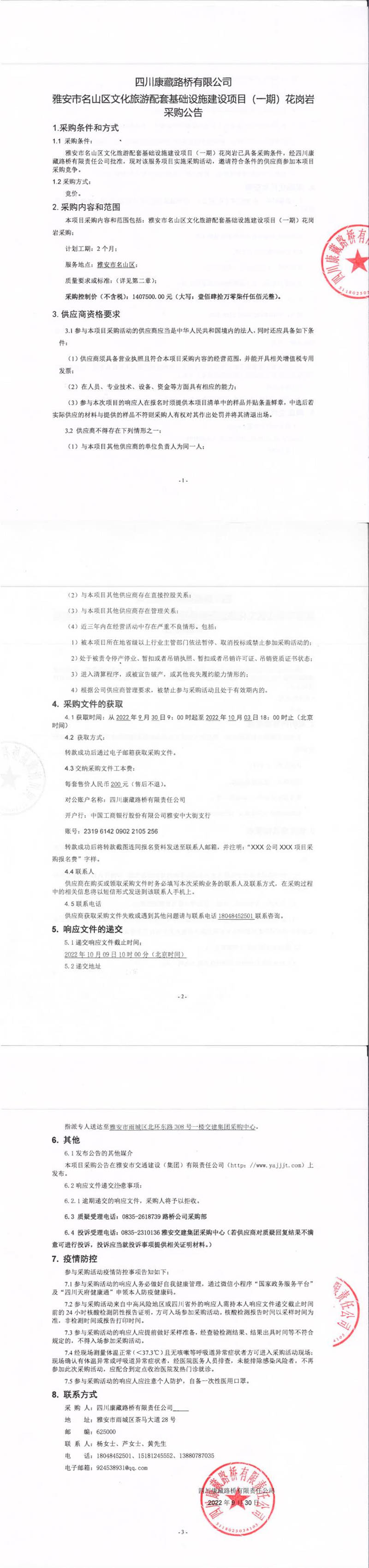 四川康藏路橋有限公司雅安市名山區(qū)文化旅游配套基礎(chǔ)設(shè)施建設(shè)項(xiàng)目(一期)花崗巖采購(gòu)公告