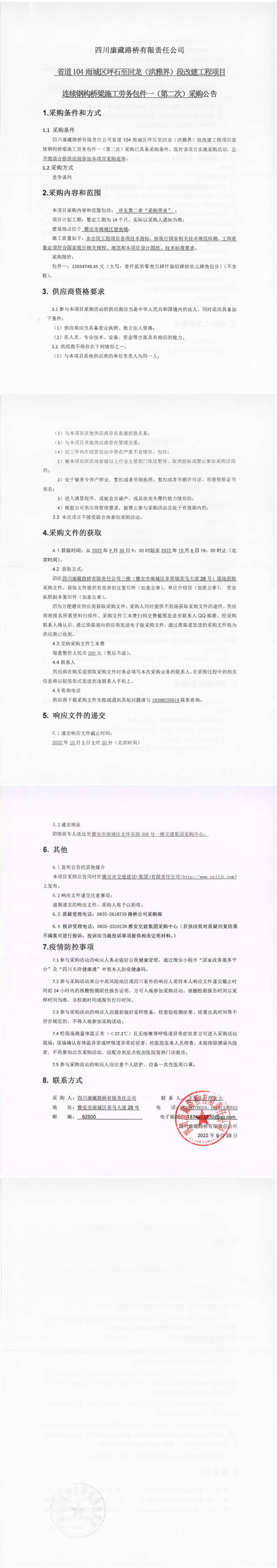 四川康藏路橋有限責(zé)任公司省道104雨城區(qū)坪石至回龍(洪雅界)段改建工程項(xiàng)目連續(xù)鋼構(gòu)橋梁施工勞務(wù)包件一(第二次)采購(gòu)公告