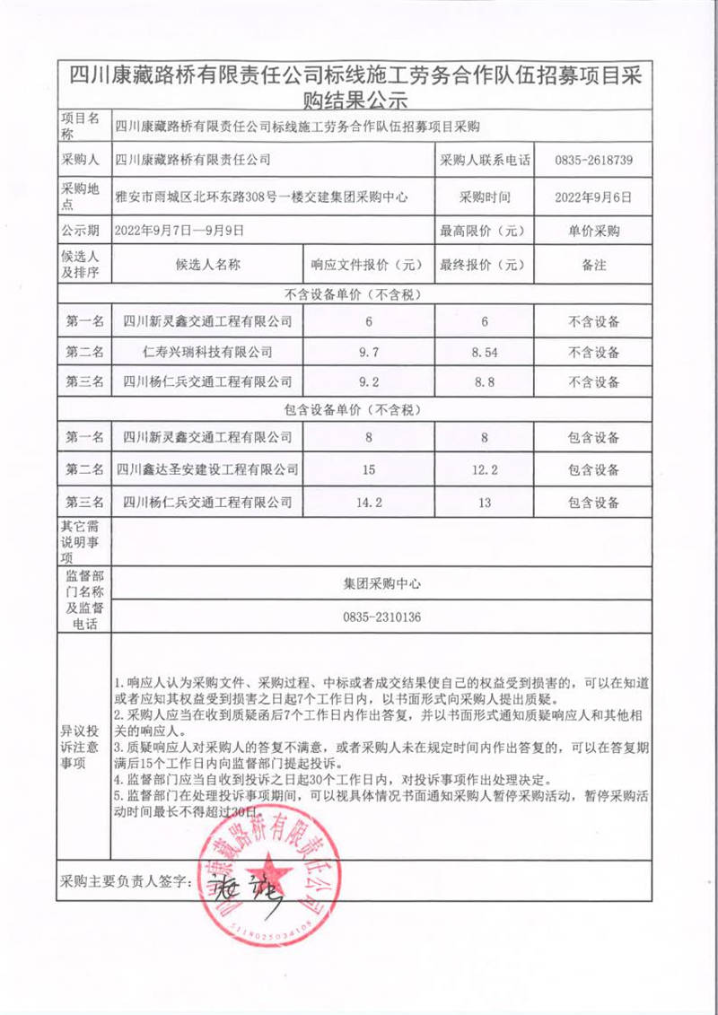 四川康藏路橋有限責任公司標線施工勞務合作隊伍招募項目采購結果公示