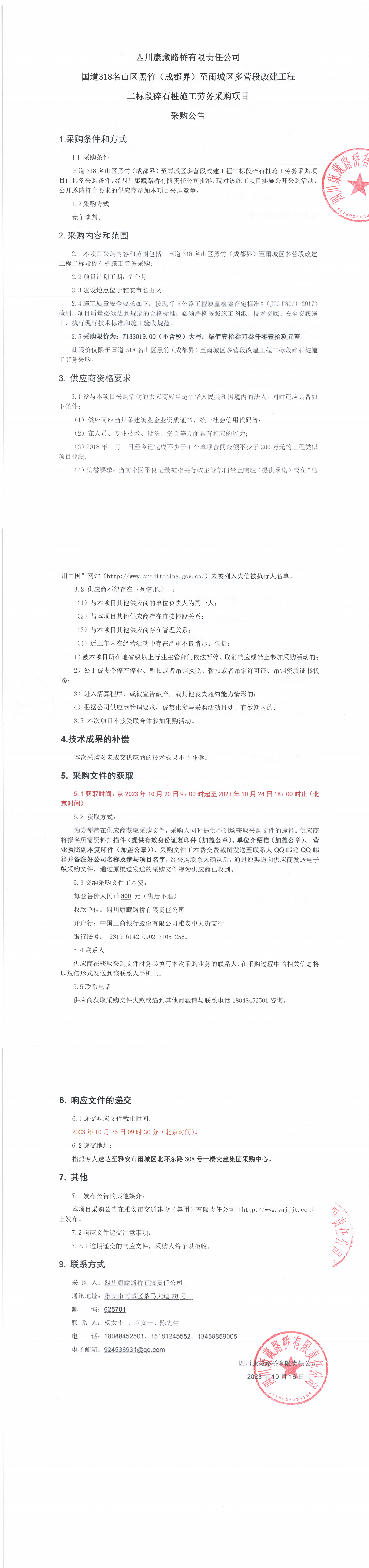 四川康藏路橋有限責(zé)任公司國道318名山區(qū)黑竹(成都界)至雨城區(qū)多營段改建工程二標(biāo)段碎石樁施工勞務(wù)采購項(xiàng)目采購公告