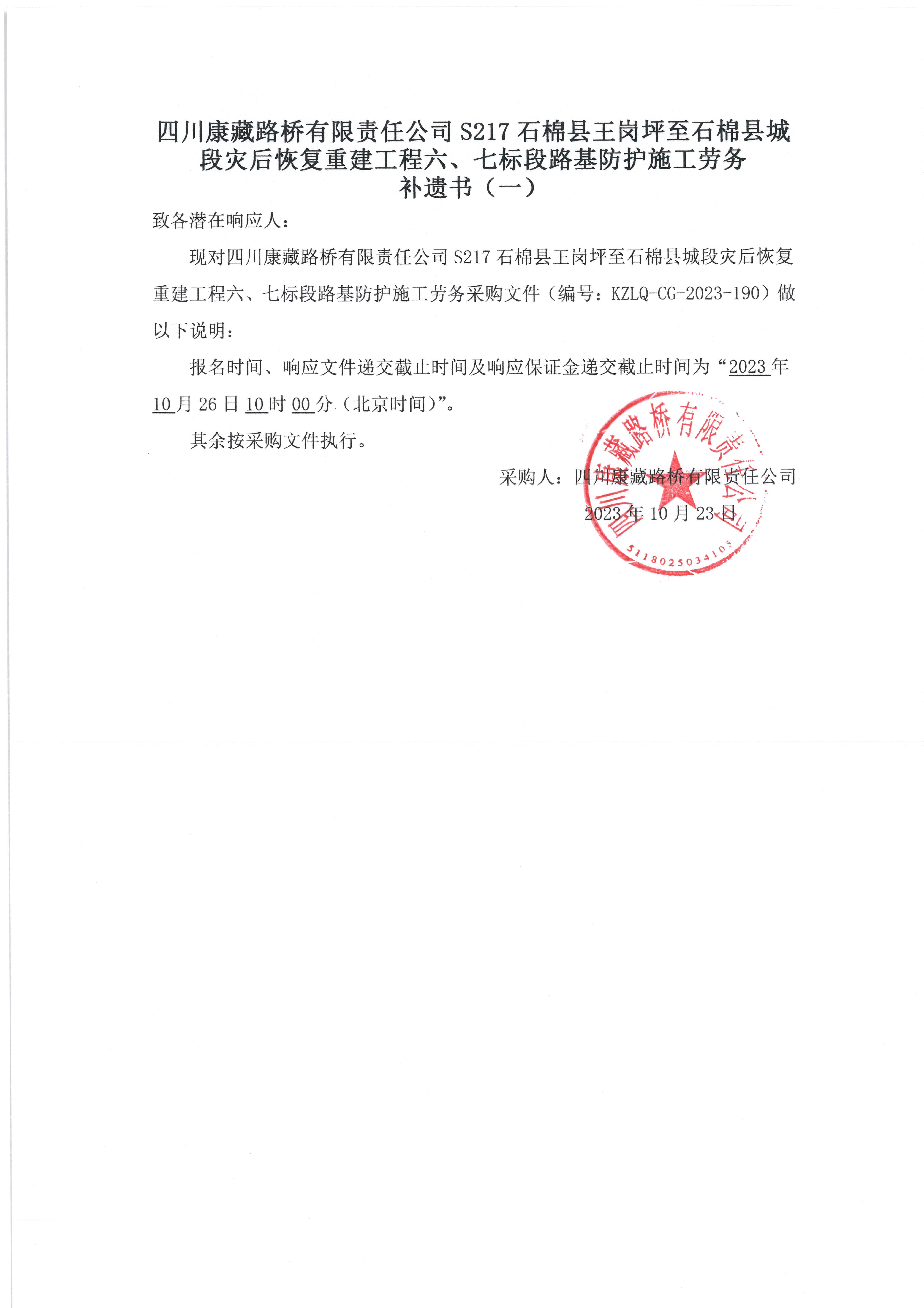 四川康藏路橋有限責任公司S217石棉縣王崗坪至石棉縣城段災后恢復重建工程六、七標段路基防護施工勞務 補遺書(一)
