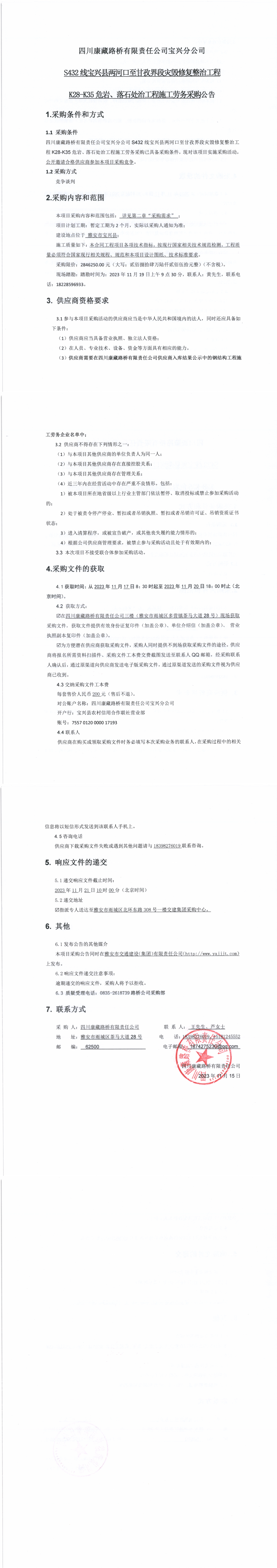 四川康藏路橋有限責(zé)任公司寶興分公司S432線寶興縣兩河口至甘孜界段災(zāi)毀修復(fù)整治工程K28-K35危巖、落石處治工程施工勞務(wù)采購公告