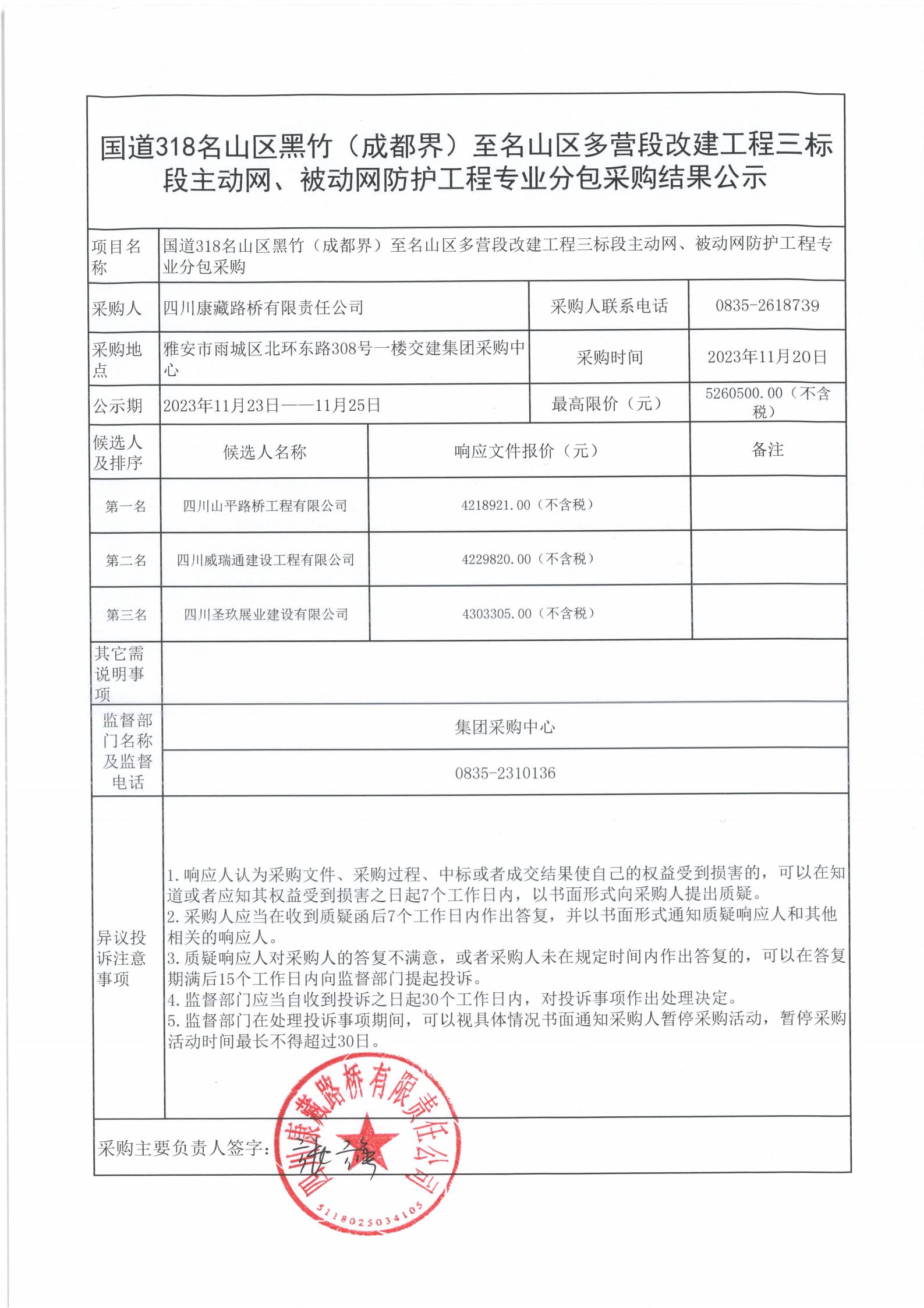 四川康藏路橋有限責(zé)任公司國道318名山區(qū)黑竹(成都界)至名山區(qū)多營段改建工程三標(biāo)段主動網(wǎng)、被動網(wǎng)防護(hù)工程專業(yè)分包采購結(jié)果公示