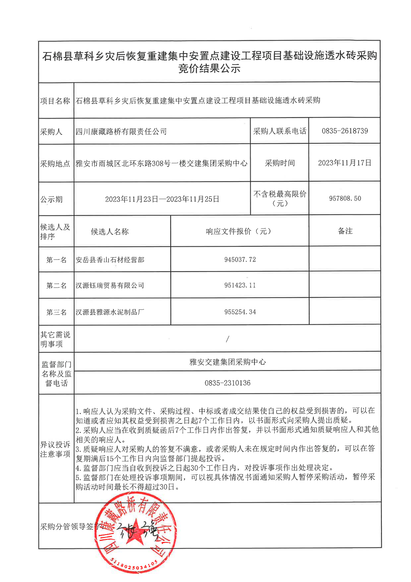 四川康藏路橋有限責任公司石棉縣草科鄉(xiāng)集中安置點重建工程項目透水磚采購結(jié)果公示