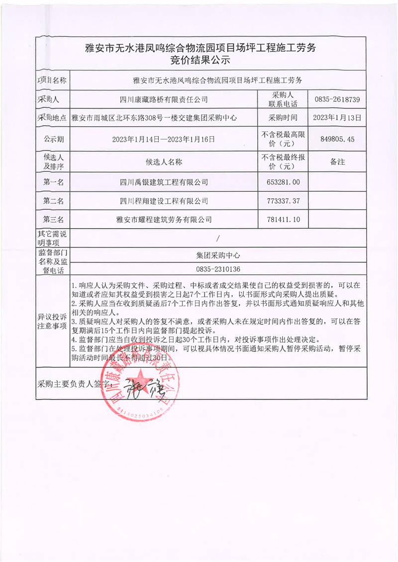 四川康藏路橋有限責(zé)任公司雅安市無水港鳳鳴綜合物流園項(xiàng)目場(chǎng)坪工程施工勞務(wù)競(jìng)價(jià)結(jié)果公示