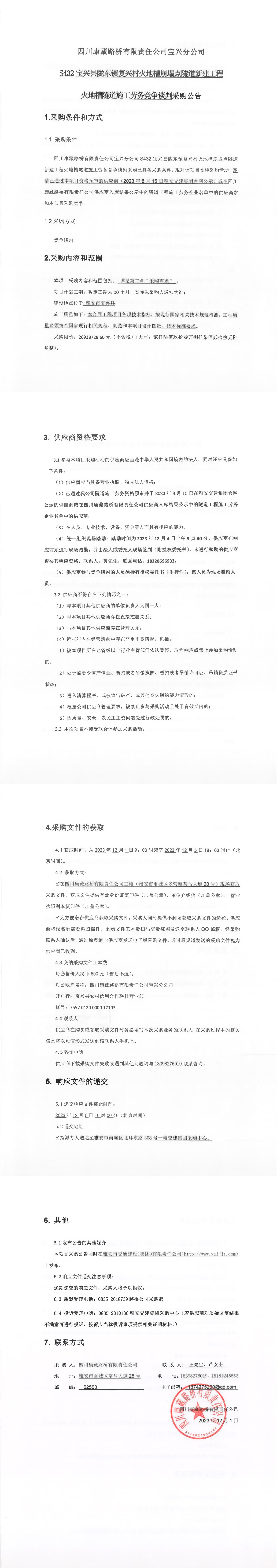 四川康藏路橋有限責任公司寶興分公司S432寶興縣隴東鎮(zhèn)復(fù)興村火地槽崩塌點隧道新建工程火地槽隧道施工勞務(wù)競爭談判采購公告