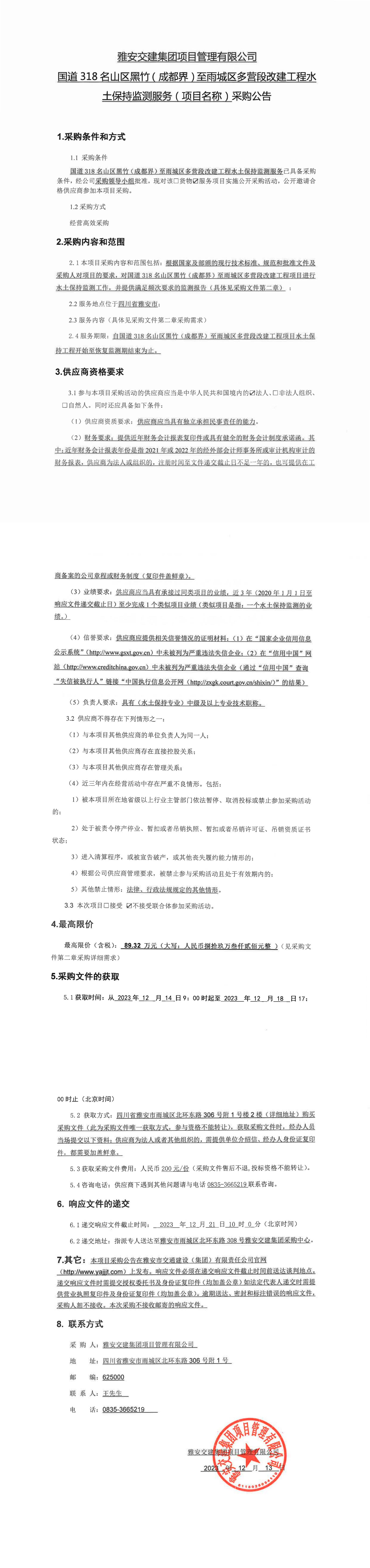 雅安交建集團項目管理有限公司國道318名山區(qū)黑竹(成都界)至雨城區(qū)多營段改建工程水土保持監(jiān)測服務(項目名稱)采購公告