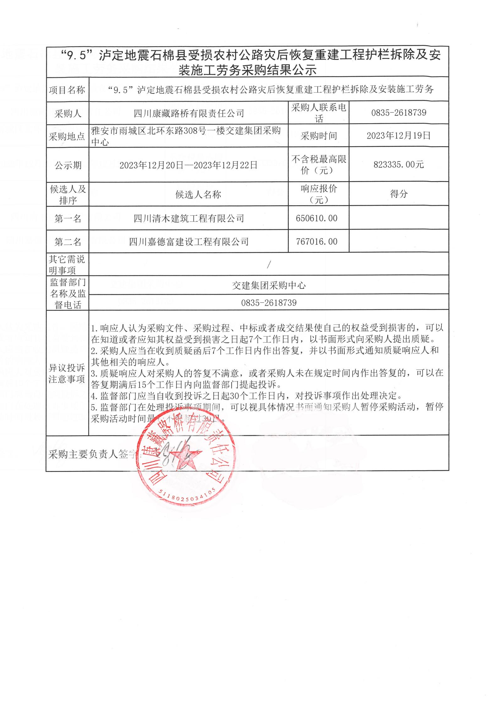 四川康藏路橋有限責(zé)任公司“9.5”瀘定地震石棉縣受損農(nóng)村公路災(zāi)后恢復(fù)重建工程護欄拆除及安裝施工勞務(wù)采購結(jié)果公示